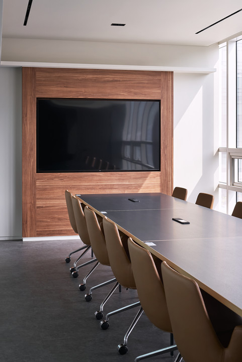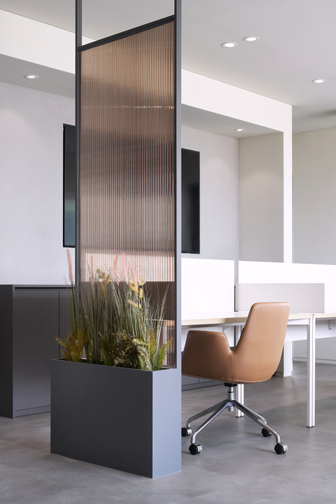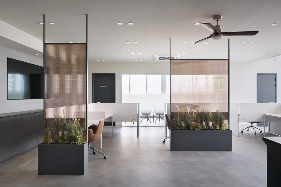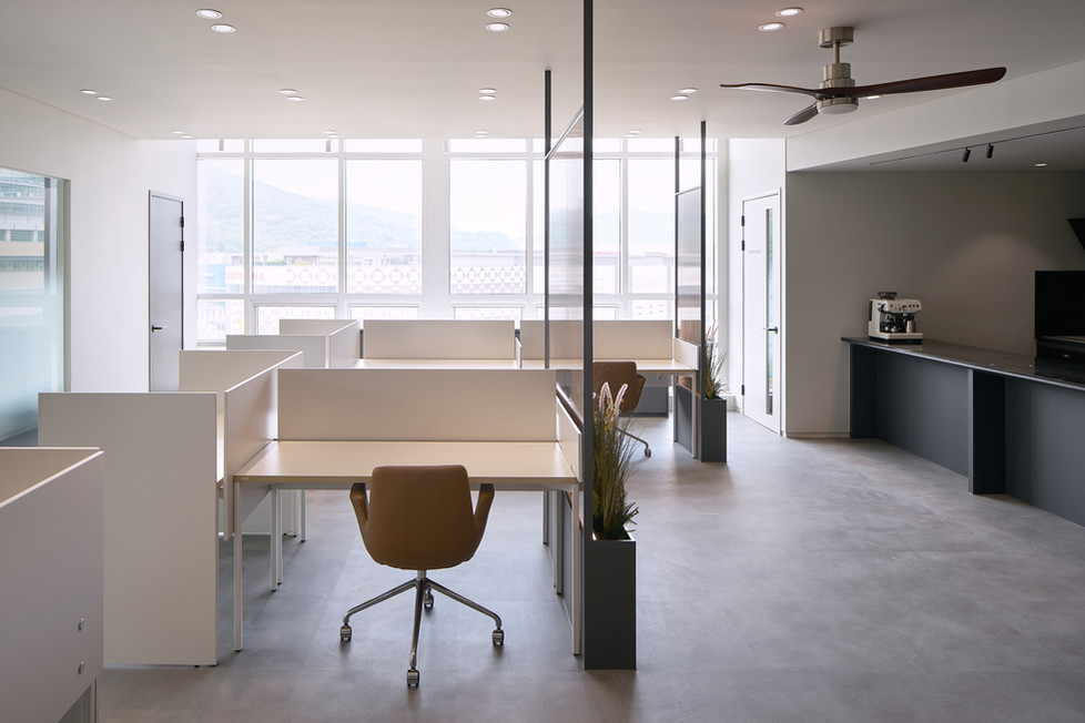 블랙과 그레이를 중심으로 한 무채색 컬러를 활용해 모던하고 시크한 공간으로 완성되었습니다. 중립적이고 차분한 분위기의 컬러 구성은 다양한 쉐이드와 톤을 통해 공간에 깊이와 리듬감을 부여하며, 시각적으로도 넓고 정돈된 인상을 줍니다. 특히 그레이는 다른 색상이나 소재와도 조화롭고, 벽면, 바닥재, 가구 등 전반에 활용되어 안정감을 높입니다. 목재, 금속, 유리 등 다양한 소재와의 조화로 세련되고 고급스러운 분위기를 만들어내며, 현대적인 업무 환경에 어울리는 균형 잡힌 공간 디자인을 완성했습니다.