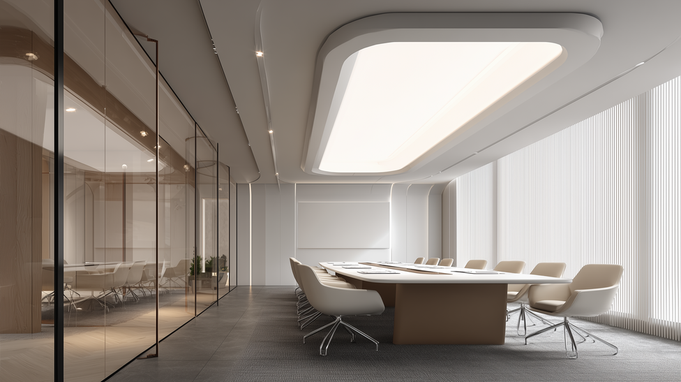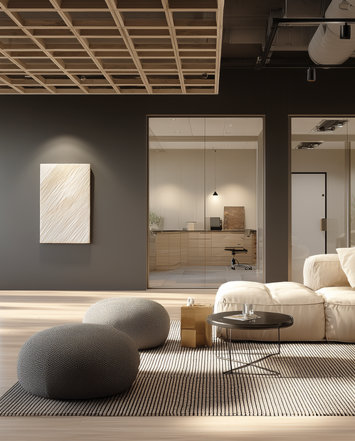 모던 스타일의 오피스 공간입니다. 노출 천장과 매립형 조명, 직선적인 구조물이 주는 산업적 무드 위에 밝은 우드 톤 가구와 따뜻한 중성 컬러를 사용해 차가움을 완화했습니다. 개방감 있는 오픈플랜 레이아웃과 큰 창으로 자연광을 적극 활용해 쾌적함과 투명성을 강조하며, 소파 라운지·워크스테이션·수납 영역을 유기적으로 배치해 협업과 휴식을 자연스럽게 연결하도록 구성했습니다.