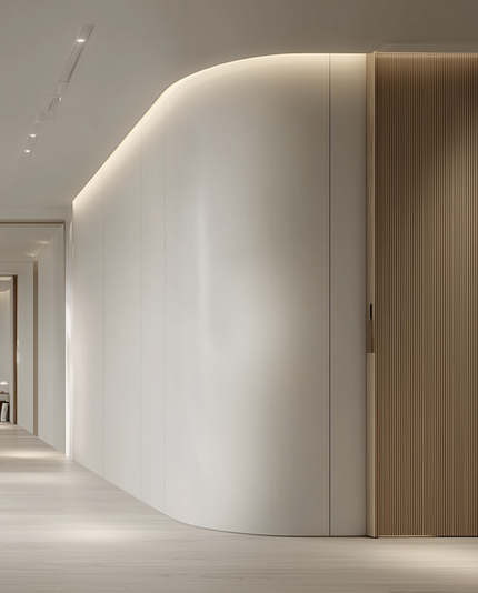 부드러운 그레이베이지 톤과 따뜻한 우드 질감을 중심으로, 공간 전체가 차분하게 이어지도록 디자인했습니다. 매끄럽게 흐르는 곡선 벽과 라인 조명이 자연스러운 흐름을 만들어주며, 빛과 그림자가 공간의 깊이를 부드럽게 드러냅니다. 과한 장식 없이 형태와 비례, 소재의 질감에 집중하여 세련된 미니멀리즘을 완성했고, 절제된 색감 속에서도 따뜻함이 느껴지도록 디테일을 조정했습니다. 전체적으로 고요하면서도 단단한 분위기를 담아내, 머무는 이에게 안정감과 여유를 전하는 공간으로 완성했습니다.