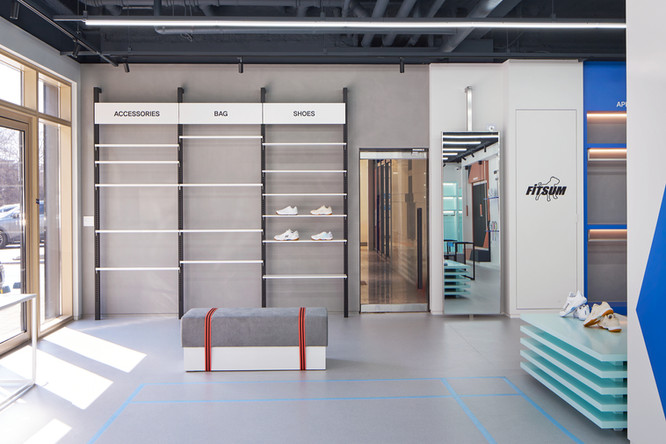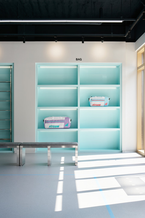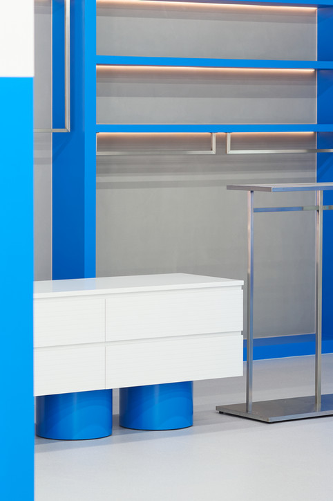 금속의 질감과 아크릴의 깊은 색감이 어우러져 공간 전체는 불필요한 장식을 배제하고, 선과 면의 구조미를 강조하여 마치 하나의 설치 작품처럼 완성한 의류브랜드 공간입니다. 스틸 프레임은 공간의 경계를 만들면서도 시야를 가리지 않아 개방감을 주고, 블루 빛이 반사되며 브랜드의 아이덴티티를 시각적으로 각인시켰습니다. 반대측 벽면의 파스텔 블루는 금속의 강한 인상을 부드럽게 중화시키며, 전체적으로 젊고 트렌디한 무드를 전달했습니다.