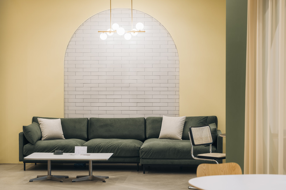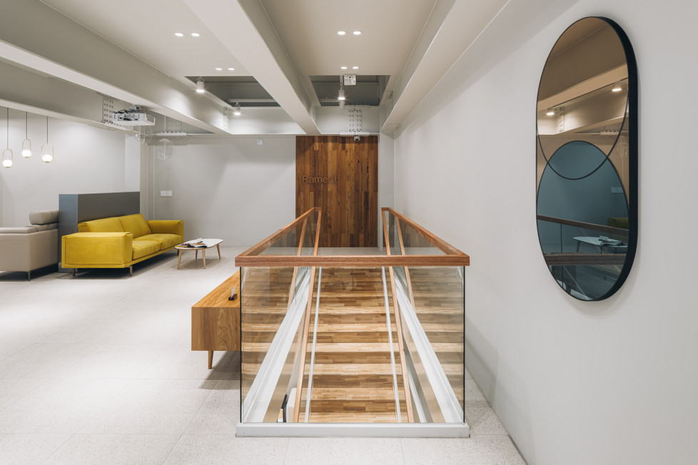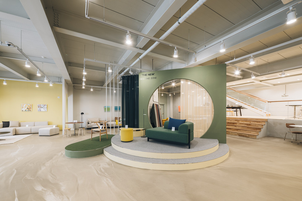 부스 형태의 파티션을 중심으로 구성된 가구 브랜드 쇼룸으로, 시즌마다 다양한 분위기를 연출하며 가구가 자연스럽게 공간에 녹아듭니다. 러프한 질감의 셀프 레벨링 바닥과 브랜드 컬러를 활용해 가구의 존재감을 강조했고, 중앙 메인 부스는 부드러운 곡선으로 브랜드의 정체성을 표현했습니다. 타원형 전시 부스는 식재와 곡선 유리를 통해 자연스러운 따뜻함을 전하며, 유리 블록으로 외부 시선을 차단하면서도 채광은 그대로 살렸습니다. 원목의 질감을 극대화해 브랜드 철학을 직관적으로 담아낸 감각적이고 편안한 쇼룸입니다.